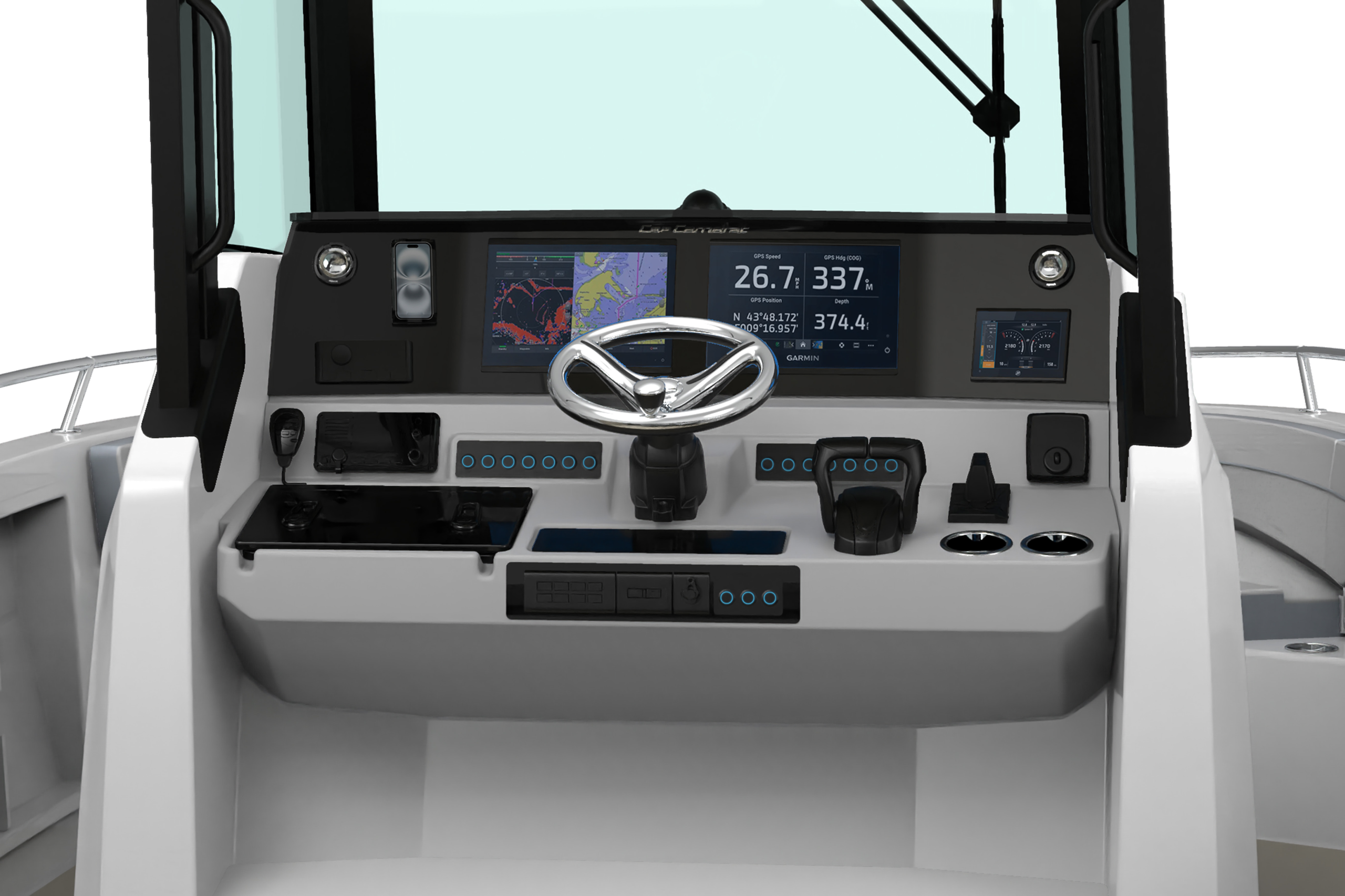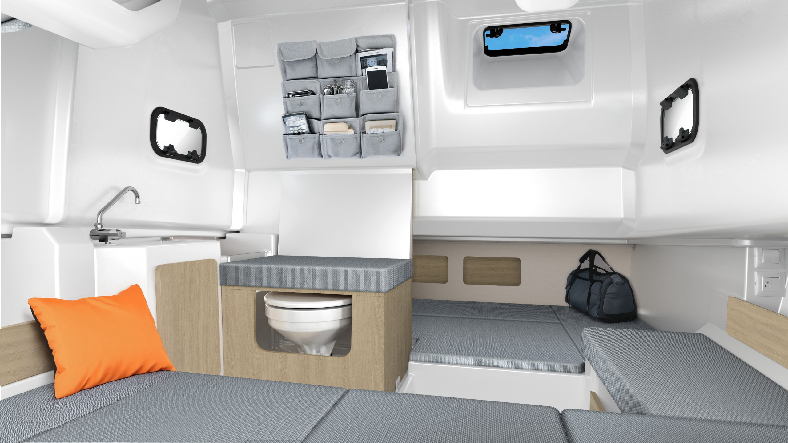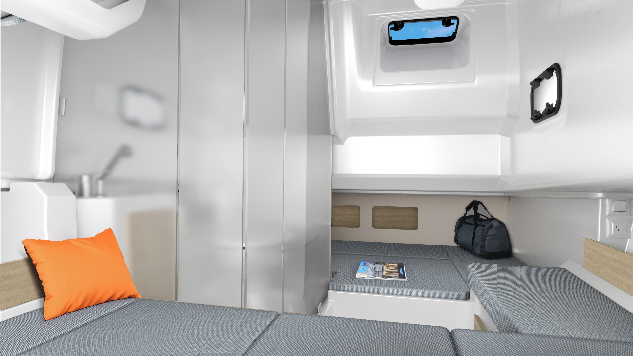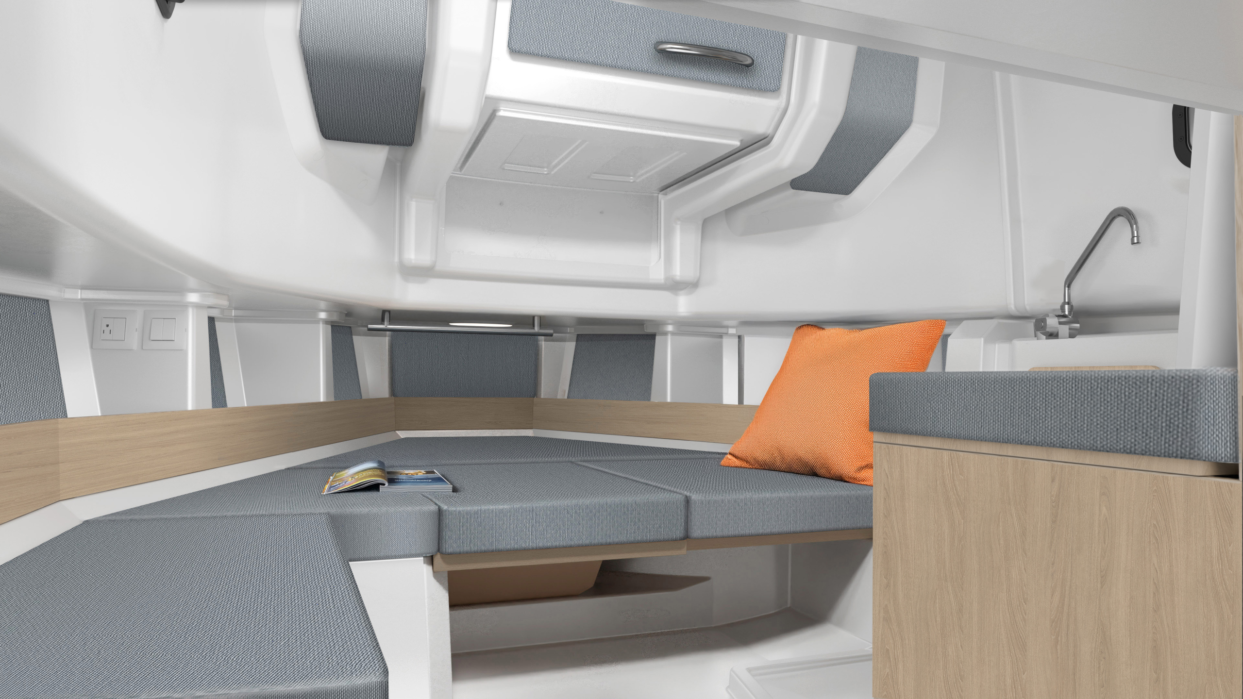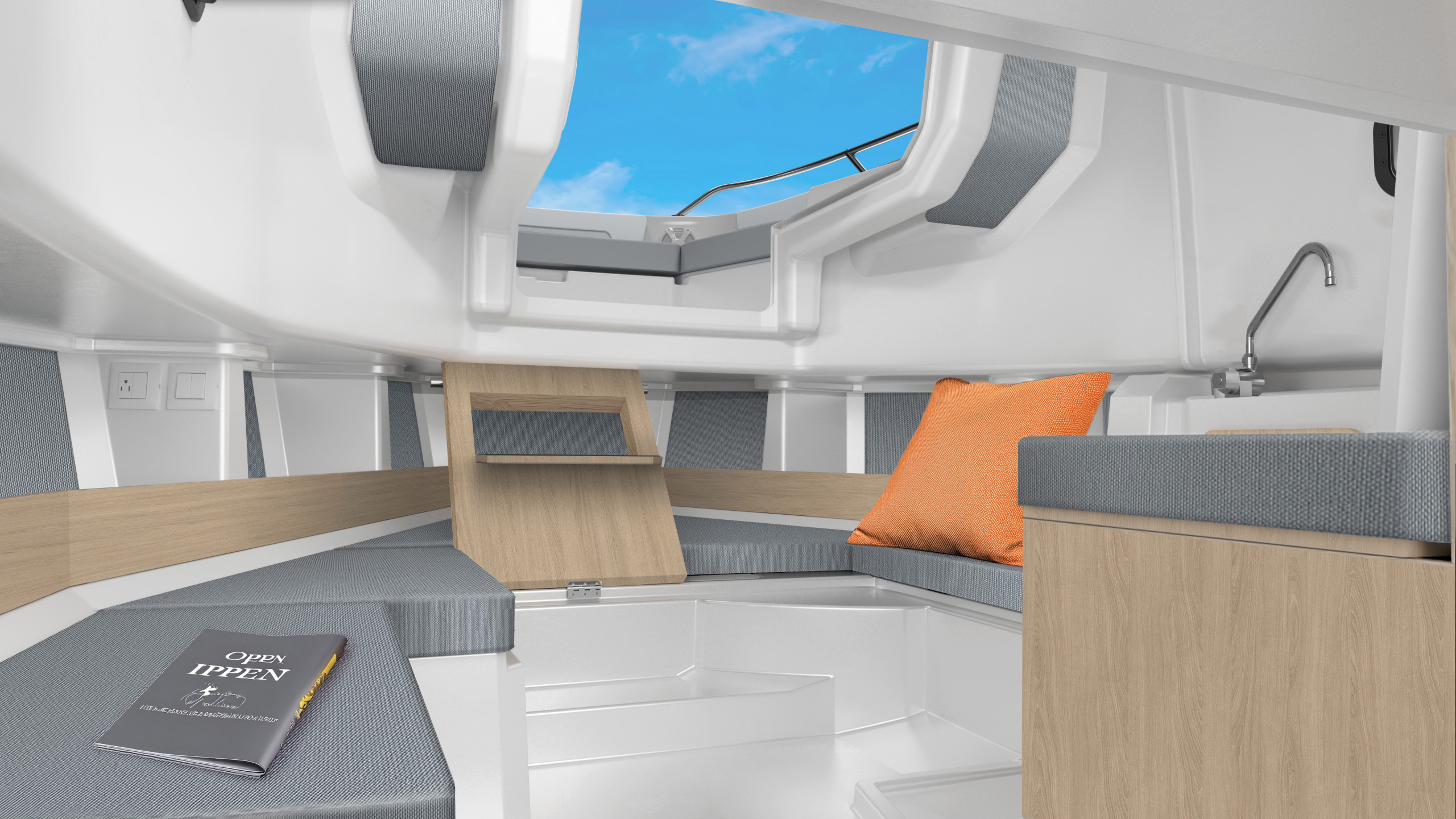Premišljena razporeditev omogoča različne postavitve kokpita, široki obhodni prehodi pa varno gibanje po plovilu. Premec se lahko spremeni v prostorno sončno ploščad, pod palubo pa vas pričaka udobna kabina z ležiščem in ločenim straniščem – idealna za krajše pobege.